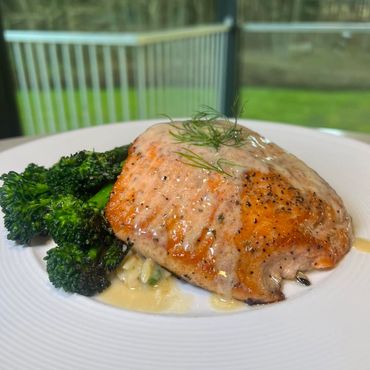 Pacific NW salmon basted with garlic dill butter. Served with Calrose rice, grilled broccolini, and lemon butter sauce