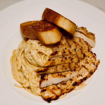Linguini pasta, made to order alfredo sauce, and parmesan cheese. Served with grilled crostini bread. Additional protein options available