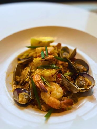 Saffron Rice, Manila Clams, Shrimp, Salmon, Uli's Andouille Sausage, Chicken, red pepper, and garlic